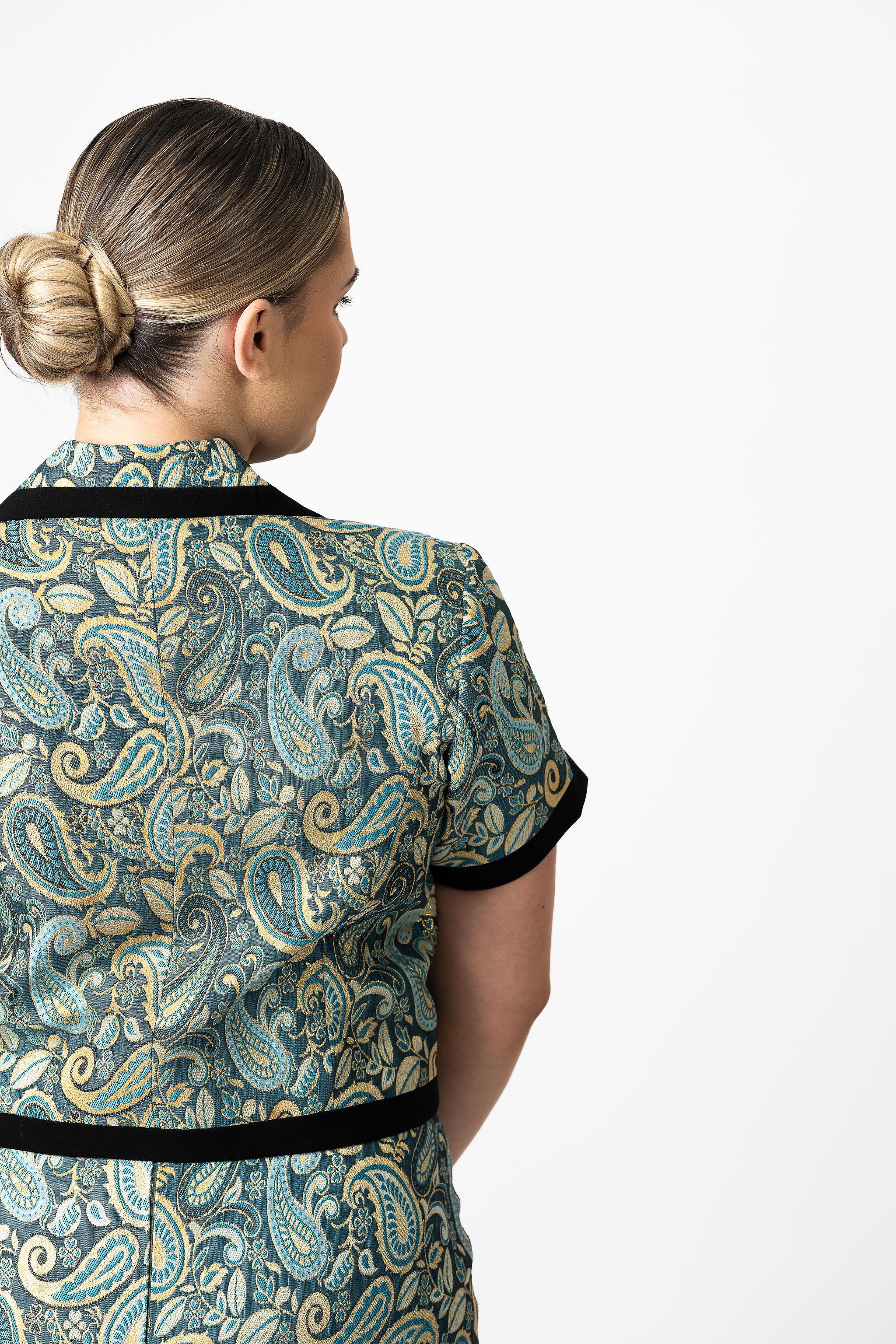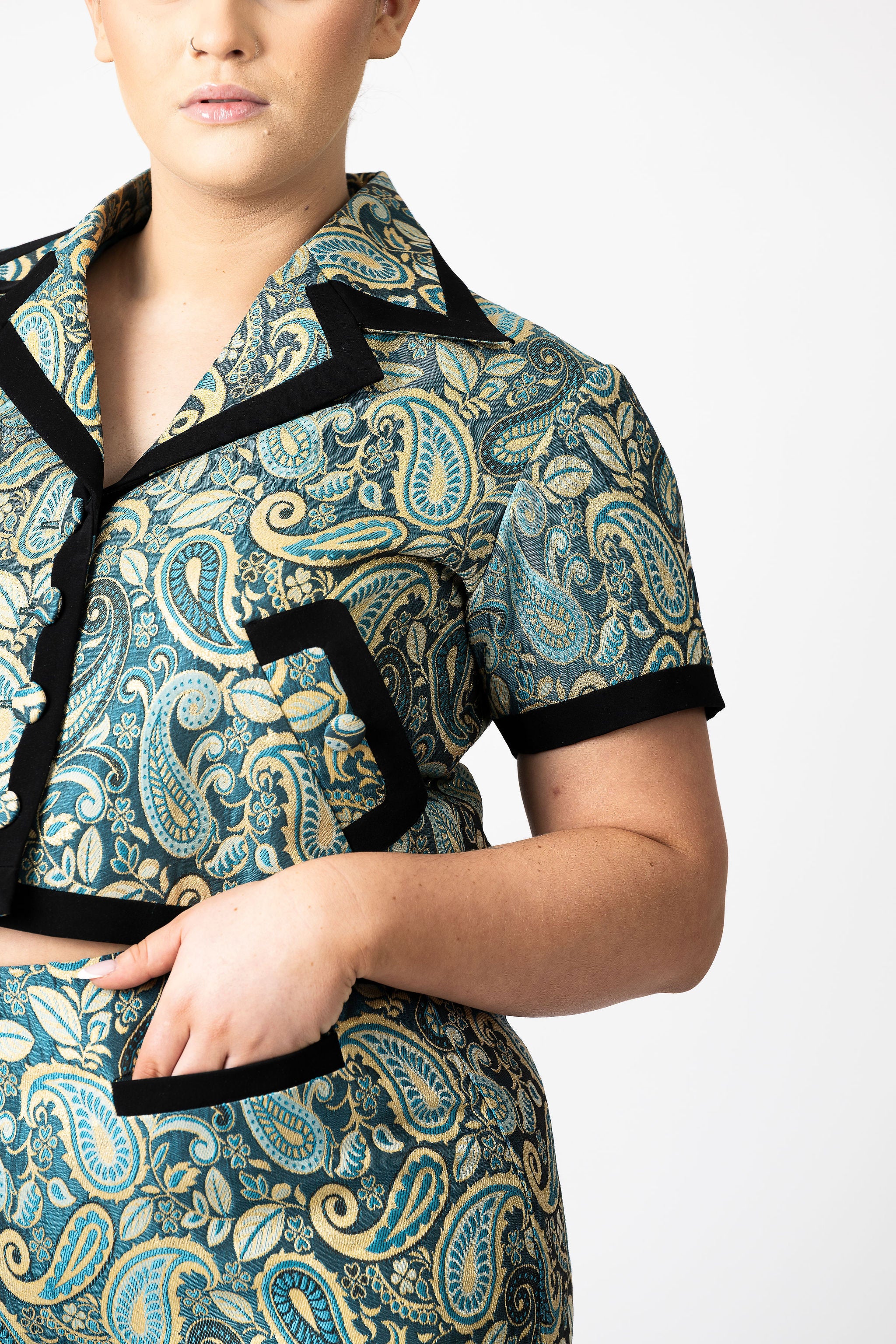 A visual melody in teal and gold, the Teal Symphony Suit brings harmony to every note of its design. Crafted from a textured, tweed-style paisley fabric, the short-sleeve jacket features black piped trim, a crisp collar, button closure, and two side pockets. The matching skirt echoes its rhythm with two front pockets, an invisible back zip, and piping along the hemline for balance and definition.